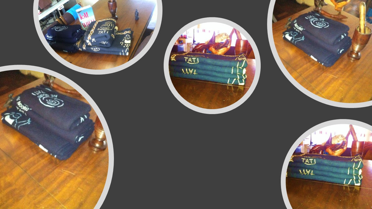 Indigo textiles with Tati's licensed artwork.